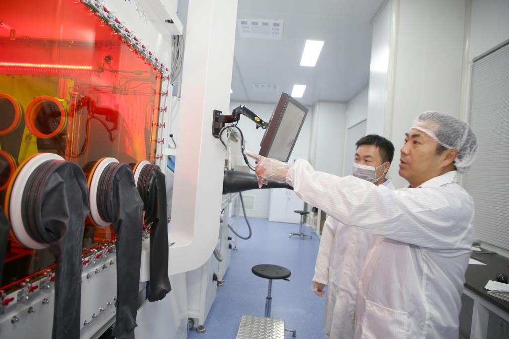 杜祖亮教授(右)指导青年教师开展量子点显示屏核心技术研发工作