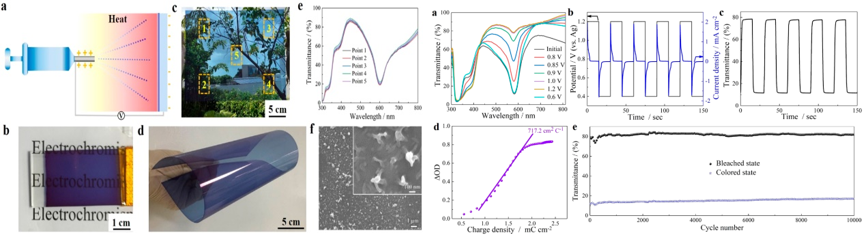 In this work, the authors fabricated large-area flexible electrochromic films (810 cm2) on flexible and rigid substrates based on PolyFe by utilizing electrostatic spraying technology. The prepared PolyFe thin film exhibits excellent electrochromic properties, such as ultra-high coloring efficiency (750.3 cm2 C−1), ultra-fast coloring speed (<1s), and robust cyclic stability (optical modulation range without significant attenuation after 10,000 cycles).