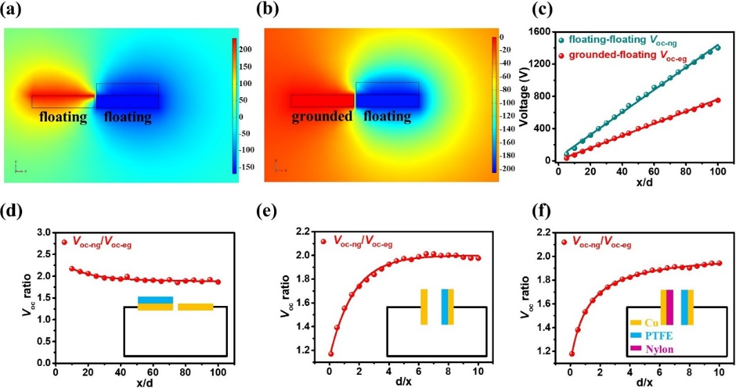 Fig. 2. Three-dimensional model finite element method calculation of the Voc of three modes TENGs in the non-grounded and grounded cases. The potential distribution of a sliding freestanding triboelectric-layer mode TENG in the non-grounded (a) and grounded (b) cases. The open-circuit voltages of the sliding freestanding triboelectric-layer mode TENG under different x/d in the non-grounded and grounded cases (c). The Voc ratio of the sliding freestanding triboelectric-layer mode TENG under different x/d in the non-grounded and grounded cases (d). The Voc ratio of different working mode TENG under different d/x in the non-grounded and grounded cases: metal-dielectric vertical contact-separation mode TENG (e), dielectric-dielectric vertical contact-separation mode TENG (f). The inset of (d–f) is the equivalent circuit of the corresponding working mode of TENG, respectively.