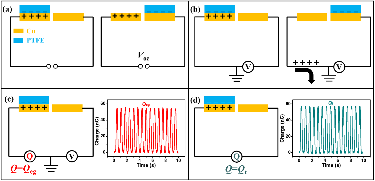 Fig. 1. Demonstration the electrode-ground charge transfer during the grounded measurement method of Voc of TENG, here, a sliding freestanding triboelectric-layer mode TENG is selected as an example. (a) The equivalent circuit for measuring Voc under ideal condition. (b) The equivalent circuit for measuring Voc by grounded measurement method. (c) The equivalent circuit for measuring the transferred charge between electrode and the ground by grounded measurement method of measuring Voc and the measured transferred charge. (d) The equivalent circuit for measuring the total transferred charge and the curve of the total transferred charge of the TENG.