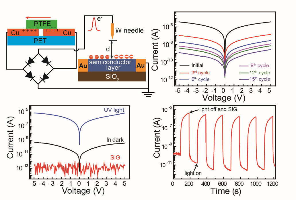The nanomaterials with high specific surface area can adsorb gas ions, such as O2-, etc., which play an important role in regulating the electrical and photoelectric properties of nanomaterials as a floating gate. Therefore, we proposed the "Surface Ion Grid (SIG)" technology based on the triboelectronic nanogenerator (TENG). The previous research results have proved that the SIG technology can regulate the photoelectric characteristics by gas ion adsorption on semiconductor as a floating gate to, whether the one-dimensional ZnO nanowires or two-dimensional MoS2 films.