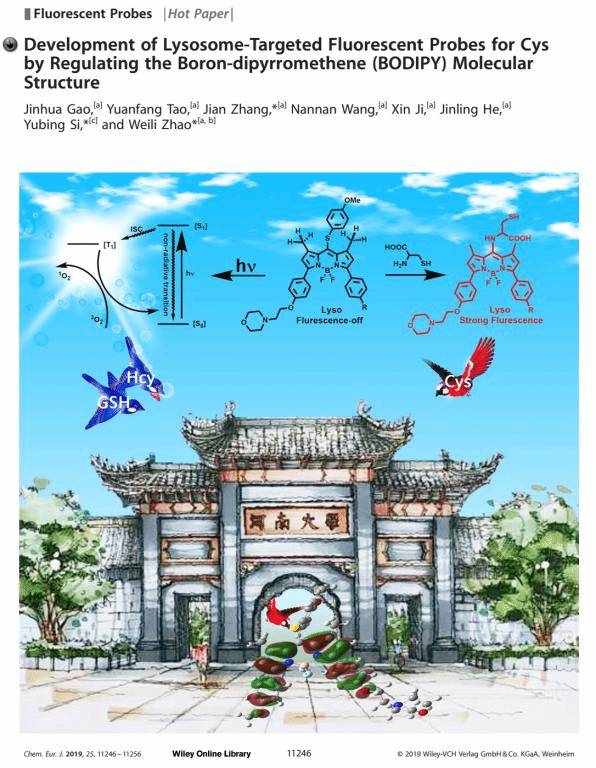 Recently, Professor Weili Zhao’s group has successfully constructed a fluorescent probe with lysosomal targeting and specific detection of Cys by modifying BODIPY dye. This paper was selected as Hot Paper and Frontispiece Paper.