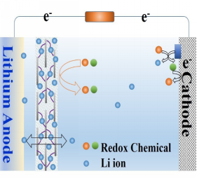 Schematic diagram of high lithium ion content diaphragm blocking redox molecules from shuttle between positive and negative electrodes