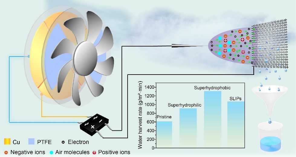To this context, researchers have designed a variety of artificial fog collection systems inspired by the relationship between microscale structures and efficient fog collection function occurred in natural world. Due to the comprehensive advantages of low cost, excellent aging resistance, zero power consumption, and easy preparation, mesh typed (especially metal meshes) fog collectors have been widely applied to collect fog in large scale. Traditional mesh fog collectors capture fog droplets mainly through inertial collision. Along the wind stream, fog droplets advance and collide with mesh frames, namely deposition. When droplet accumulation gets to a critical size, it slides down off the mesh surface under gravity and is collected by storage vessel. To be noted, the mesh openings do not collect fog droplets, but decrease the pressure drop before and after the mesh, further help to maintain the fog flux towards the fog collector. Despite of decades of endeavor, the biggest challenge in fog collection remains to be low deposition efficiency as well as low shedding off rate of water droplets, which hinder continuity and also lead to poor fog/water conversion efficiency, about 1%-2%, of the final fog collection cycle.