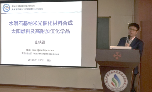 2019年11月3日(星期日)上午,应特种功能材料重点实验室邀请,中国科学院理化技术研究所张铁锐研究员莅临实验室进行学术交流,并做了题为“水滑石基纳米光催化材料合成太阳燃料和高附加值化学品”的精彩报告。本次报告会由材料学院副院长/特种功能材料重点实验室副主任白锋教授主持,学校相关领域的老师和研究生参加了此次报告会,现场气氛热烈,座无虚席。