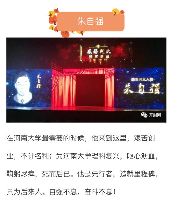 为庆祝建校105周年,深入挖掘改革开放以来学校涌现出的先进典型人物,树立师生身边榜样,学校开展“感动河大”人物评选活动,朱自强先生入选。9月25日晚,学校在明伦校区大礼堂举行了隆重的颁奖典礼。