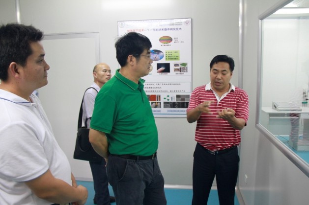 陈处长参观了分子组装、原子力显微镜和纳米压印等专业实验室,考察了QLED平台、光伏平台和基础研究平台的建设情况。在纳米压印室,杜祖亮详细介绍了实验室最近几年组建起来的纳米压印技术、原子层技术和喷墨打印技术。他说,利用这些成套的具有国际先进水平的实验技术,可以大面积、低成本的制备纳米精度的图案,这是发展纳米器件的关键技术。目前实验室利用这些技术平台着重开展两个方面的工作,一是新型薄膜太阳能电池方面的研究,主要目标是发展后硅时代的光伏技术;二是量子点发光二极管(QLED)的研究,研发下一代照明和显示技术。在QLED实验室,杜祖亮教授介绍了搭建的研究平台的各部分功能,汇报了目前QLED方面的研究进展。杜祖亮说,QLED具有更高能效、更低成本、色度更纯和可柔性大面积制备等突出优势,有望成为新一代发光和显示技术,在智能手机和超清电视屏等方面得到广泛应用。实验室开展该方面研究多年,近年来取得了较大进展,一些指标已达到商业化生产的要求,目前正加快研发进度,希望尽快在智能手机、大尺寸超清屏和高端照明领域等方面走向实用。