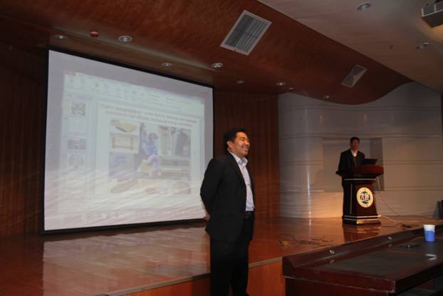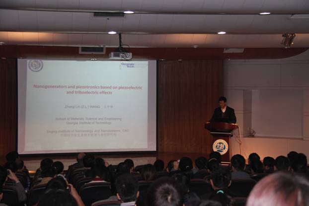 2日晚八时一到开封,王中林院士即与实验室的特聘教授们开始交流。3日上午,王院士参观了实验室后,十点在金明校区新行政楼二楼报告厅做了一场题为“Updated progress in nanogenerators and piezotronics”的学术报告。报告会由实验室常务副主任杜祖亮教授主持,特种功能材料重点实验室及兄弟院系相关专业的师生参加了报告会。