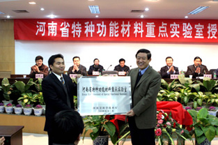 1月12日上午,河南省特种功能材料重点实验室授牌仪式在行政楼一楼会议室举行。河南省科技厅厅长姚聚川、副厅长贾跃,省教育厅副厅长李文成及校领导张秉义、关爱和、郑邦山、王发曾、黄亚彬出席了授牌仪式。