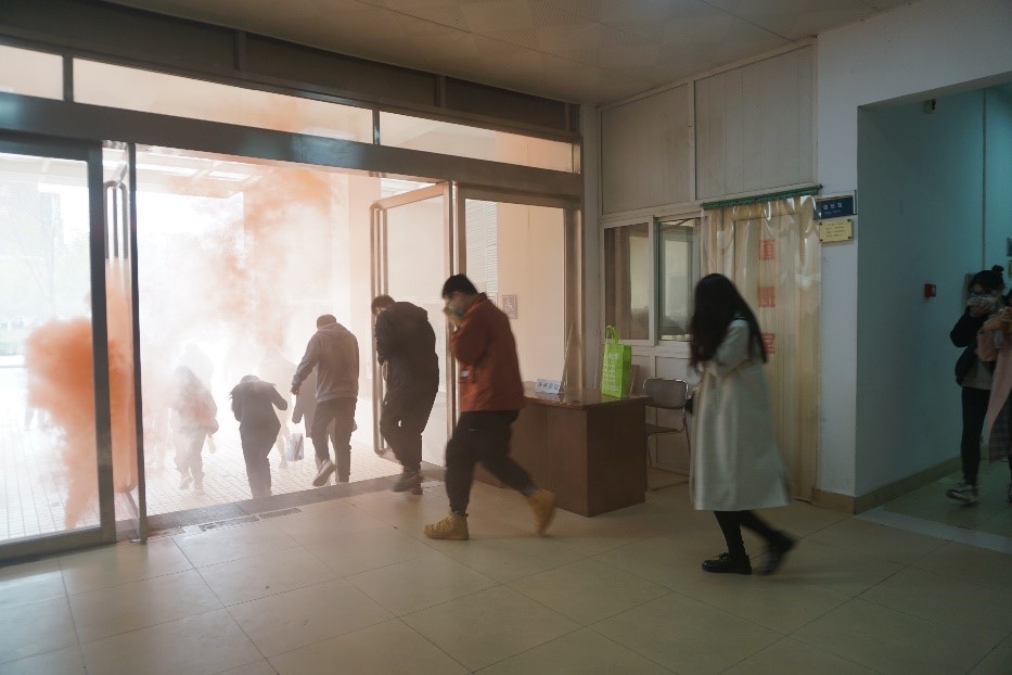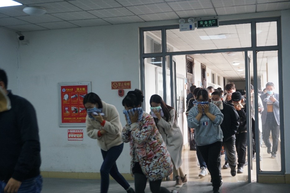 在消防知识培训之后,由马建军科长组织开展消防应急疏散演练。演练模拟特功楼内着火,全体师生听从指挥,从消防通道有序疏散。为使演练更加形象、逼真,达到应有的效果,楼道口提前准备好了消防演习烟雾弹,逃生人员人手一条毛巾,捂住口鼻、低姿快跑。