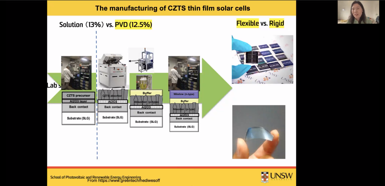围绕“Progress and future of Kesterite solar cells” 的主题,郝晓静教授重点介绍了课题组近年来在Cu2ZnSn(Se,S)4薄膜太阳能电池的工作进展以及取得的成果,随后对锌黄锡矿太阳能电池未来的发展趋势进行了展望。