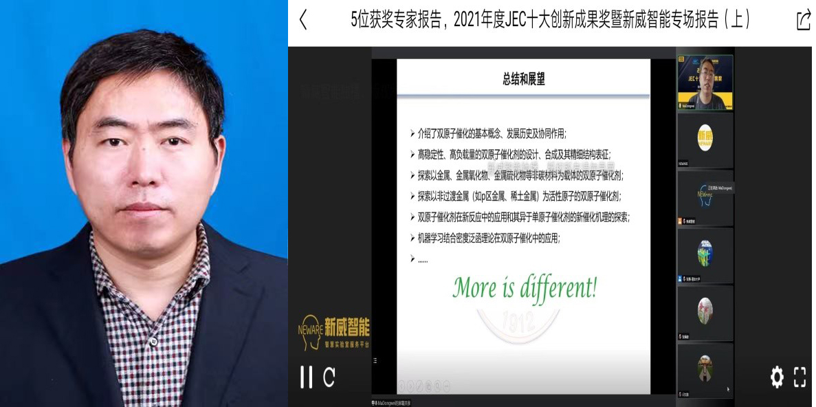 马东伟副教授毕业于复旦大学物理系,其研究领域为采用基于第一性原理的多尺度模拟方法开展催化材料、能源转换与存储材料、量子功能材料等方面的研究。主持和参与多项国家自然科学基金项目,先后在包括Angew. Chem、 ACS Catal等国内外学术期刊上发表SCI论文130多篇,SCI引用近5600次,h-index为44,其中有13篇入选ESI高被引高被引论文,是河南省教育厅学术技术带头人。在6月25日举办的颁奖和首场学术报告会上,马东伟副教授受邀做了题为“双原子催化中协同作用”的学术报告,他从双原子催化剂的基本概念、发展历史及协同作用介绍了自己在从事双原子催化剂研究所取得的成果,特别是在电化学氮气还原反应中的优势以及双金属原子协同作用调控电子结构、打破NRR关键反应中间体吸附强度的线性标度关系对氮气还原反应性能的影响,报告受到广泛关注。
