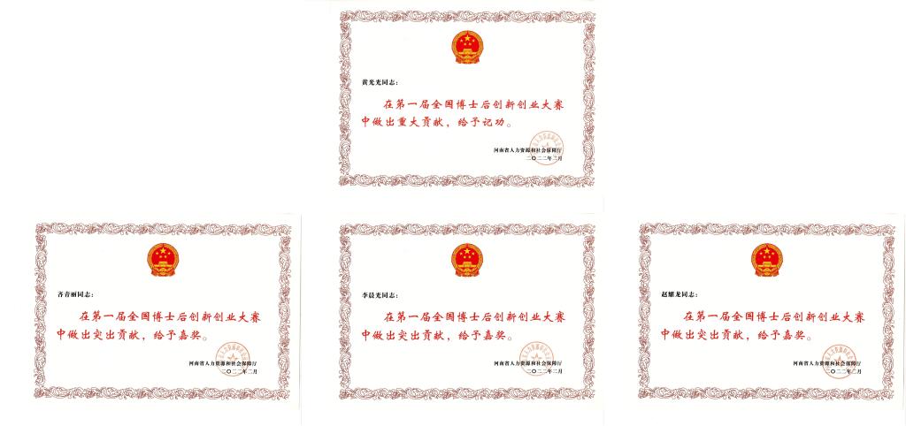 近日,由河南省人力资源和社会保障厅组织召开的第一届全国博士后创新创业大赛表彰暨全省推进博士后工作高质量发展会议上,宣读了《关于对第一届全国博士后创新创业大赛中表现突出的个人和集体奖励的决定》,给予材料学院QLED平台成员黄光光博士个人记功,吝青丽博士、李晨光博士、赵耀龙博士嘉奖。