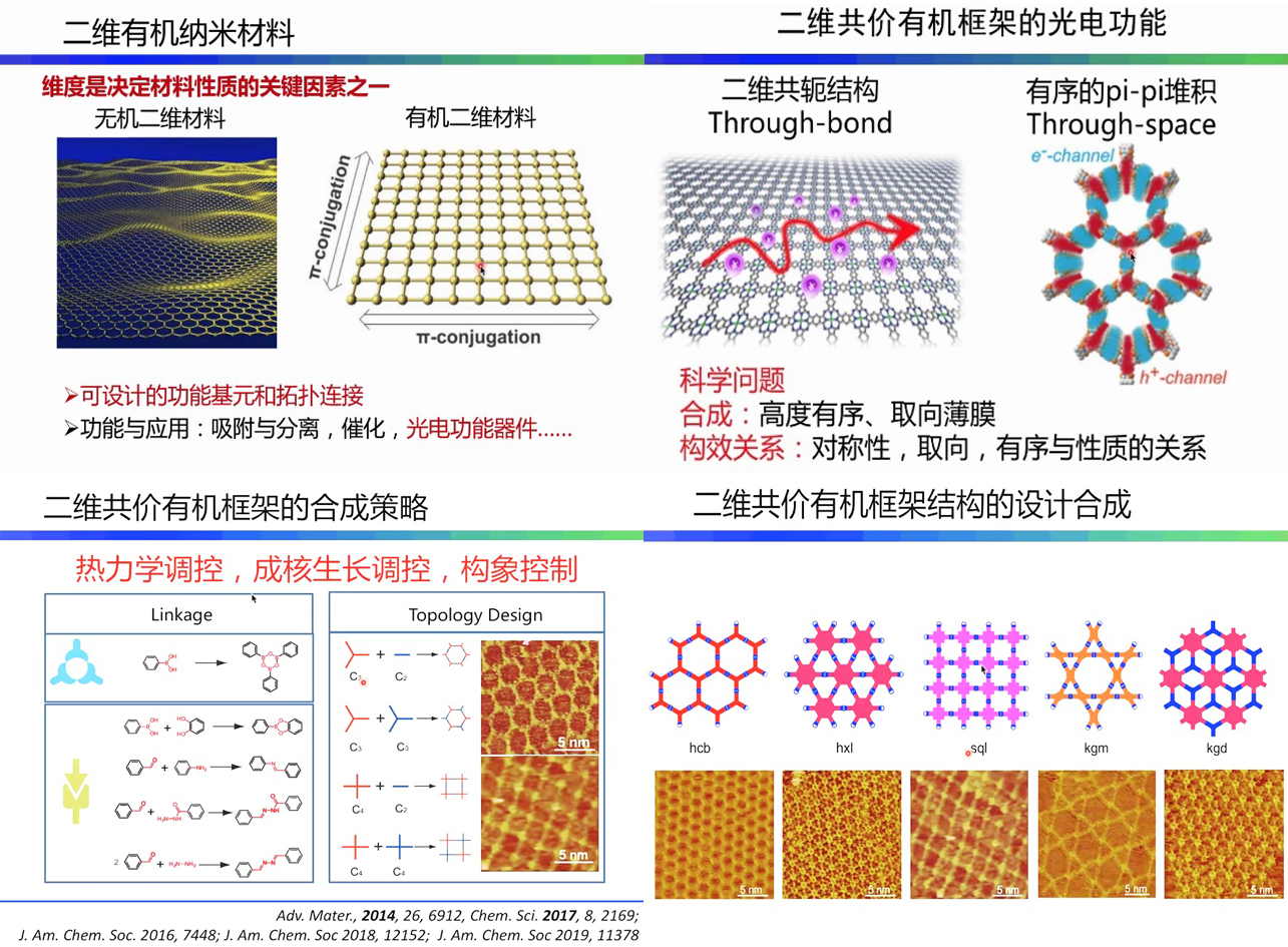 在本次学术活动中,王栋教授以“二维共价有机框架结构的表界面合成与光电功能”为主题进行了讲座,指出维度是决定材料性质的关键因素之一,有机二维材料的优势是容易设计单体,容易引入各种功能基团从而实现各种性质。通过热力学控制,成核控制,构象控制等等,实现了高度有序的纳米结构控制,获得二维共价有机框架结构。