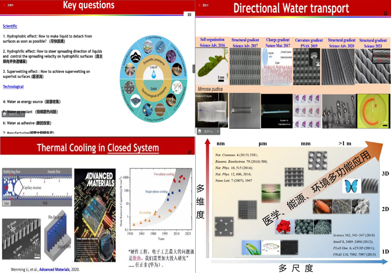 在本次学术报告中,王钻开教授以“Surfaces of things”为主题进行了精彩的讲座,指出万物的交换源于表面,结构、弧度和电荷的梯度均能够诱导液滴产生自发的定向运输。针对关键问题进行科学的解释,提出液滴在多维度多尺度上的铺展能够实现在医学、能源、环境等方面的应用。