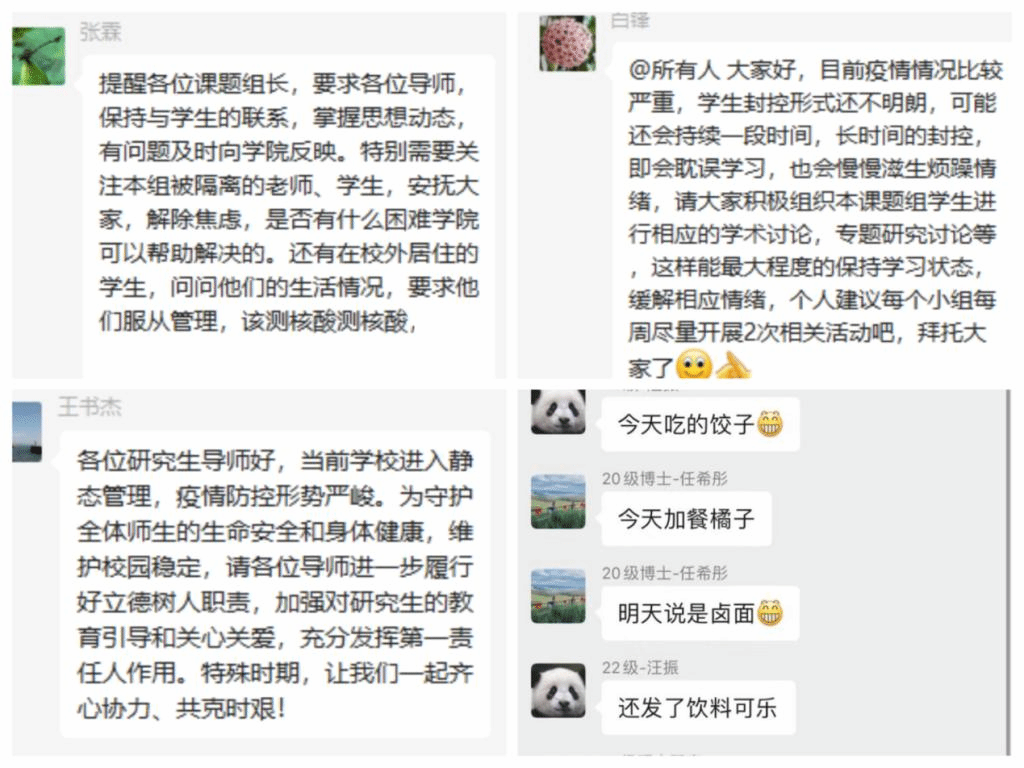 除了在抗疫一线的这些志愿者们,学院和课题组的导师们也都通过课题组工作群等渠道及时掌握了解学生情况,做好相关工作。未能参加志愿服务的老师们也在后方为这些在疫情一线的老师们加油鼓劲。