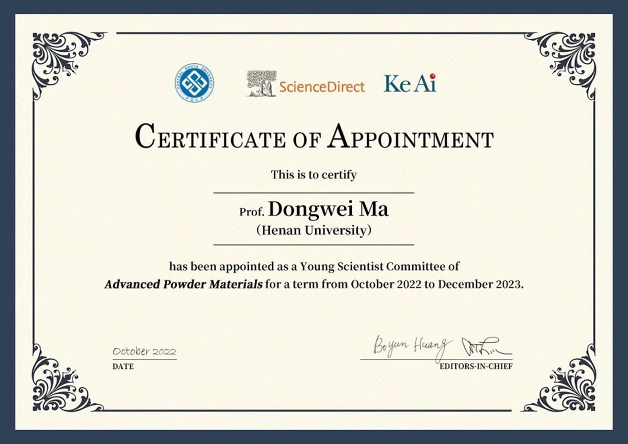 近日,材料学院贾瑜教授课题组马东伟副教授获聘国产期刊之星《Advanced Powder Materials》青年编委。