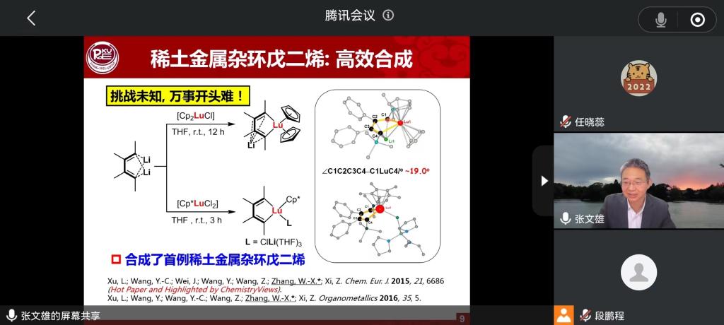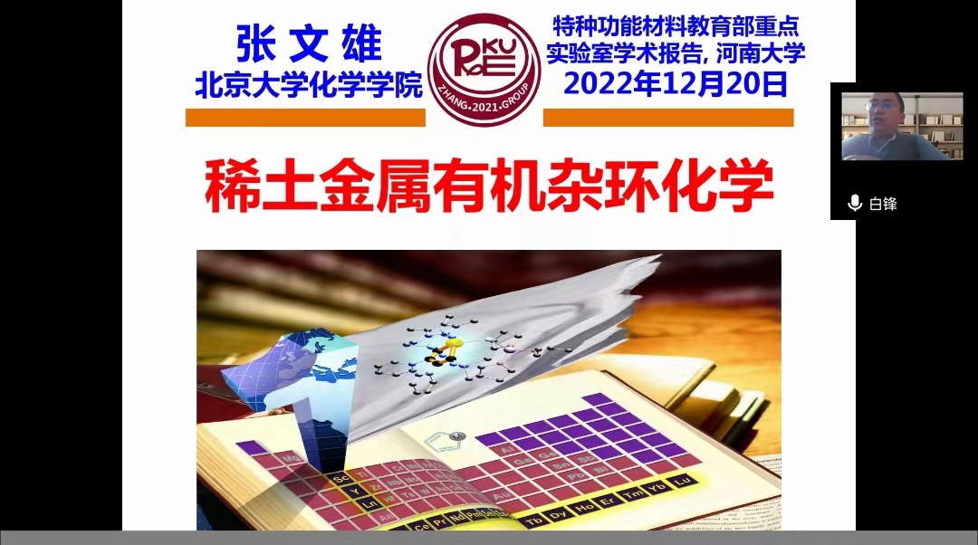 材料学院邀请,北京大学张文雄教授以《稀土金属有机杂环化学》为题为实验室师生进行了精彩的学术报告。材料学院白锋教授担任主持,报告采取线上模式(腾讯会议)进行,特种功能材料重点实验室相关领域的老师和学生参加了此次报告。
