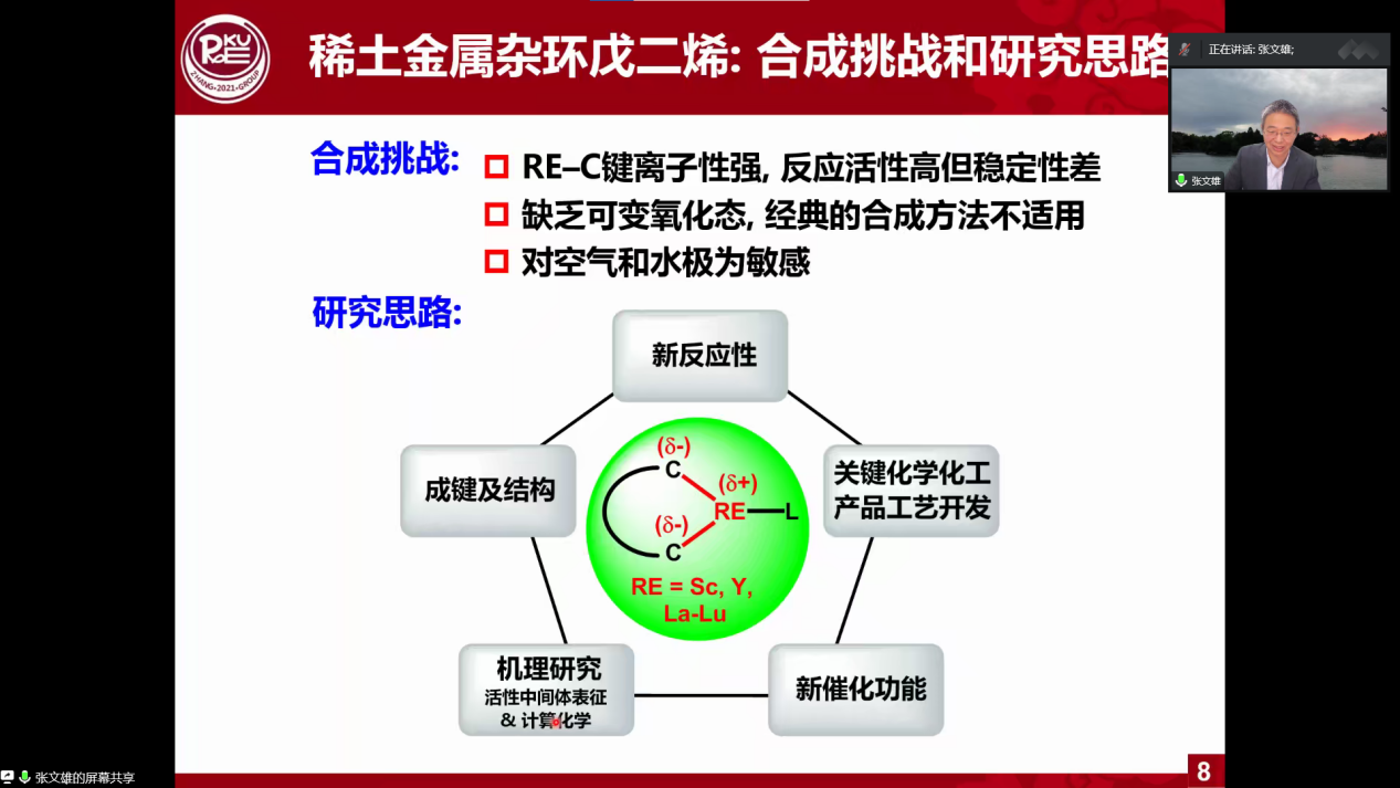 在本次报告中,张文雄教授从稀土元素出发,主要介绍了首例稀土金属杂环戊二烯、稀土杂环丙烯、桥联双卡宾钪和钐以及(N2)3--双钪杂环的合成和结构表征。在此基础上,张教授向我们讲述了如何实现从白磷和氮气出发直接构建有机膦和含氮有机化合物。报告从多角度阐述了对稀土金属有机杂环化学的研究,为我国稀土资源的综合利用提供了有效途径。