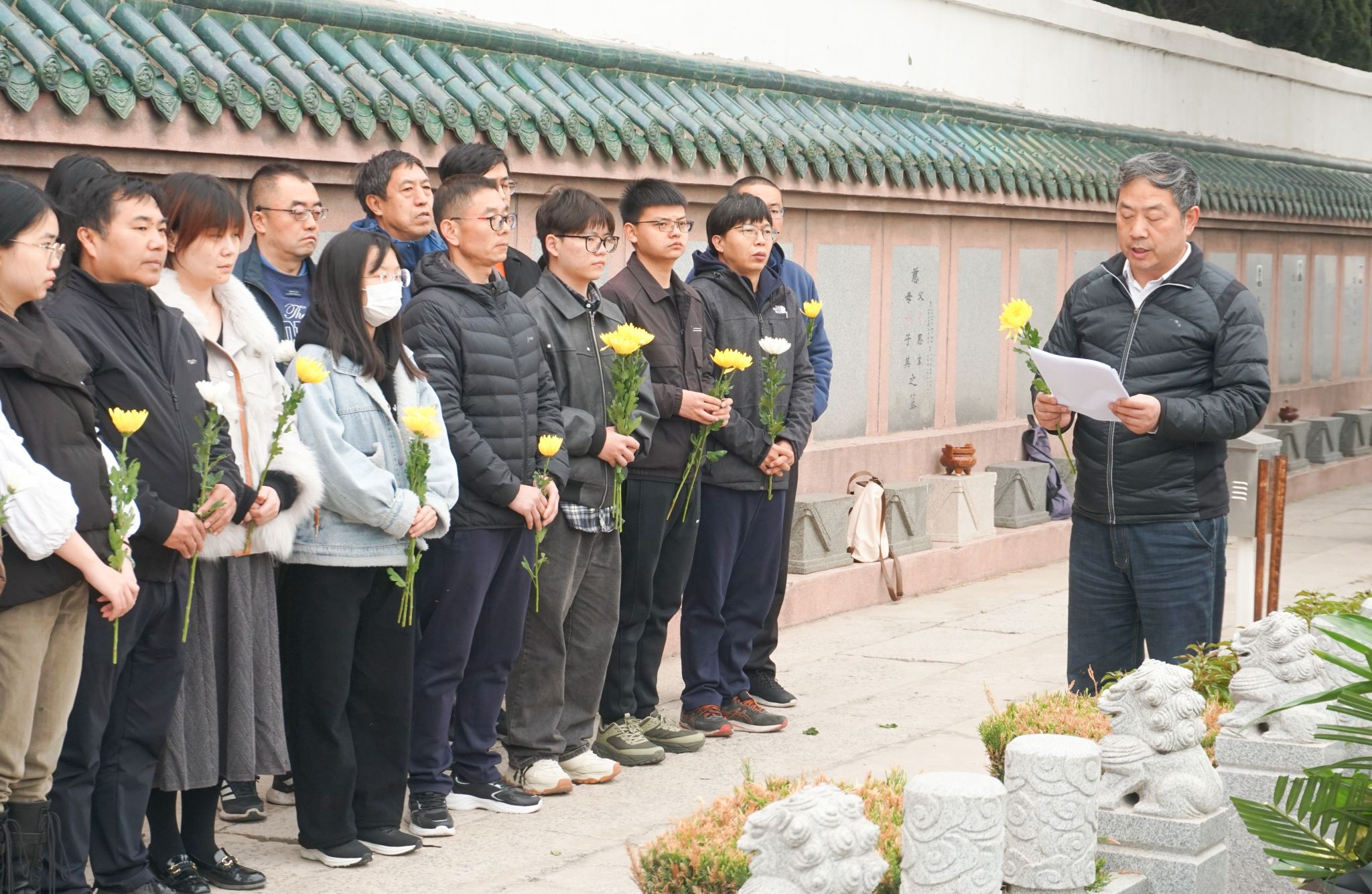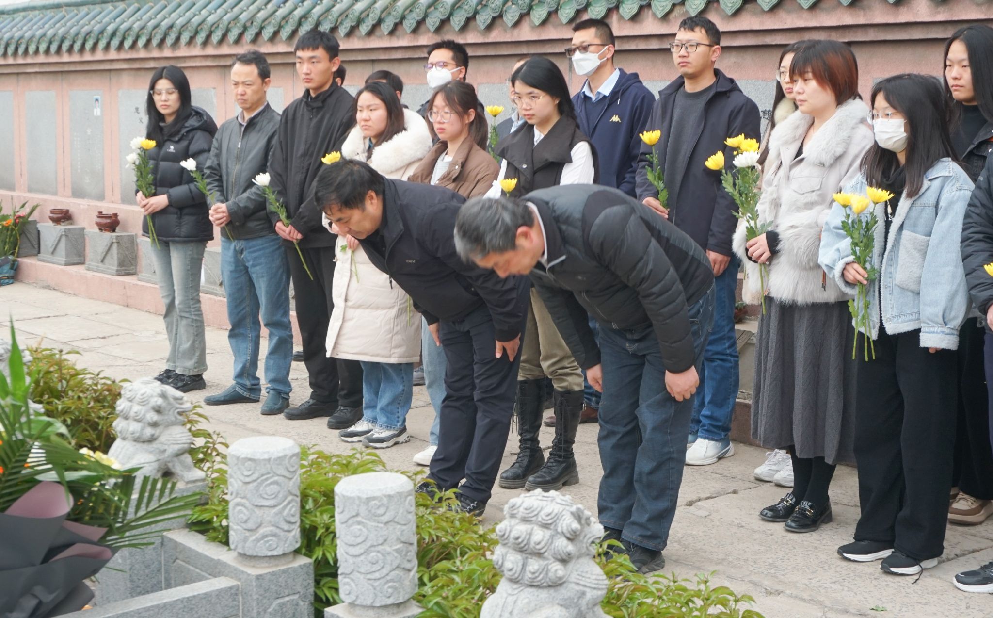 随后,在张霖和杜祖亮教授的带领下,在场师生集体默哀,并依次向三位先贤献上鲜花鞠躬致敬。