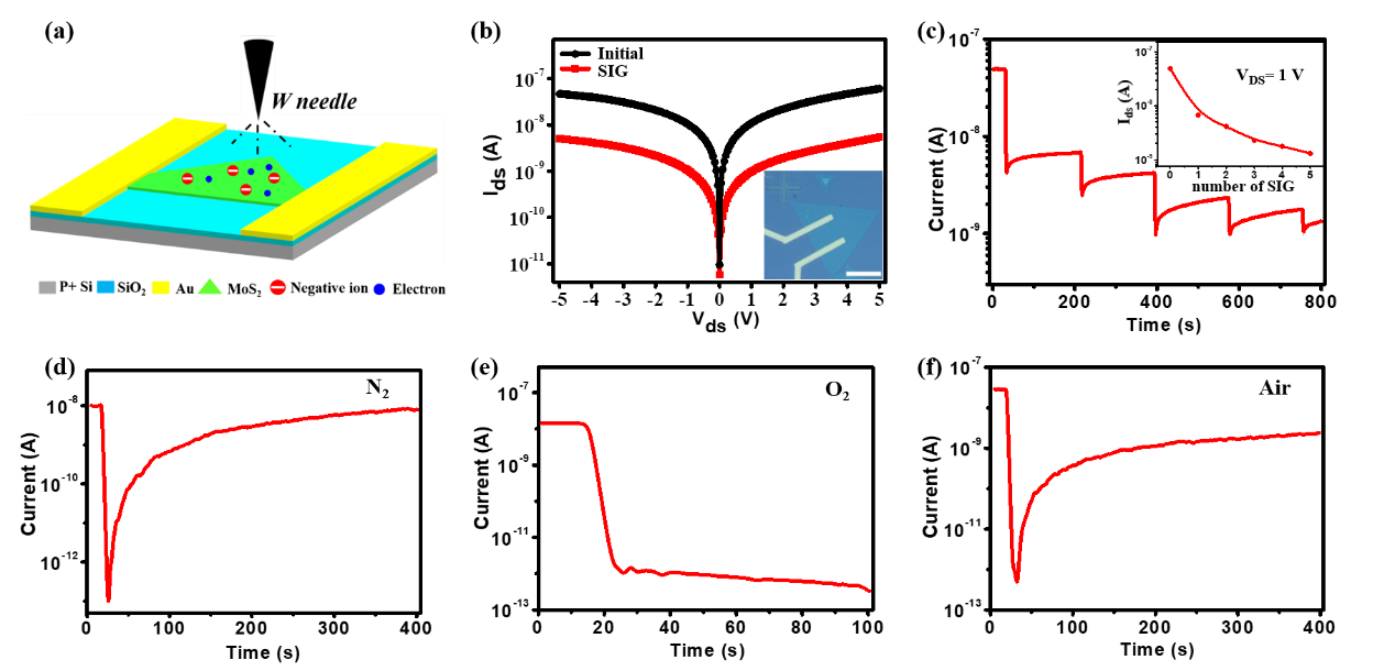 图2(a)表面离子栅调控单层MoS2器件的示意图。(b)表面离子栅调控MoS2器件前后的I-V特性曲线,插图是被调控器件的光学图像,比例尺为20 μm。(c)利用表面离子栅技术多次调控MoS2器件的I-V特性曲线,插图是器件电流与表面离子栅调控器件次数对应曲线,Vds为1V。(d)-(f)是在N2,O2和空气条件下,表面离子栅调控MoS2器件的电流-时间特性曲线。