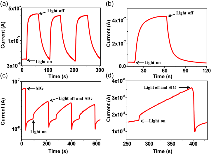 图3(a)未调控的多个照射周期下MoS2器件的I-T特性曲线。(b)线性坐标下(a)图中单个光电流周期的放大视图。(c)在表面离子栅调控下多个照射周期下MoS2器件的I-T特性曲线。(d)线性坐标下(c)图中单个光电流周期的放大视图。Vds为1V。