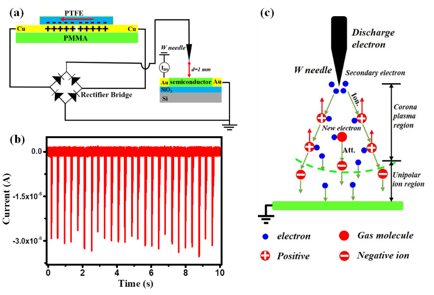 图1.(a)基于摩擦纳米发电机诱导的气体放电的表面离子栅调控技术示意图。(b)摩擦纳米发电机诱导的气体放电的电流时间曲线。(c)负电晕放电离子运动示意图。
