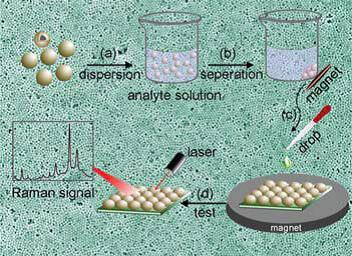 1. 利用单分散磁性银复合微球进行水相有机污染物探测过程示意图。
