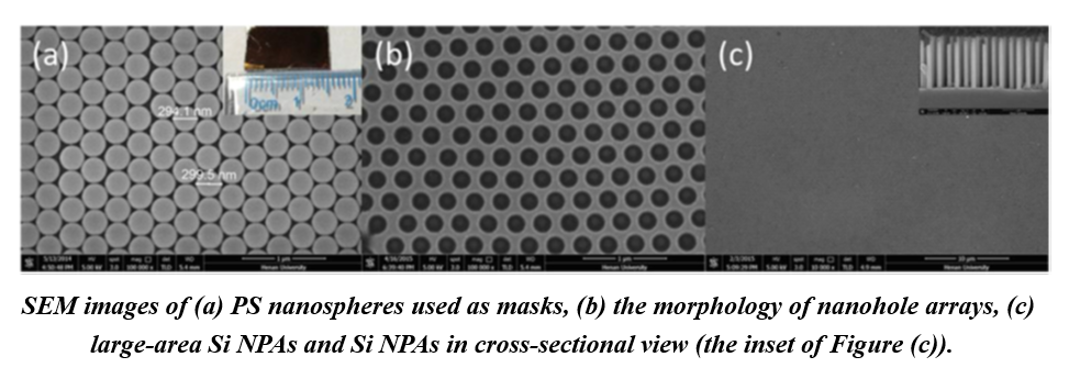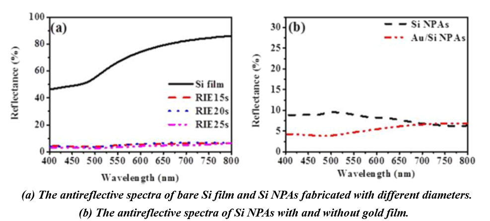 最近,杜祖亮教授课题组在利用LB和膜转移技术构筑了大面积高质量的PS单层模板。在此模板的基础上结合NSL-MACE技术构筑了尺寸可调的Si纳米柱阵列结构。该结构具有增强的抗反射和等离子特性,这种NSL-MACE技术可在光电器件中有很好的应用。相关工作在Nanotechnology (2016, 27, 315601 IF=3.573)上发表。