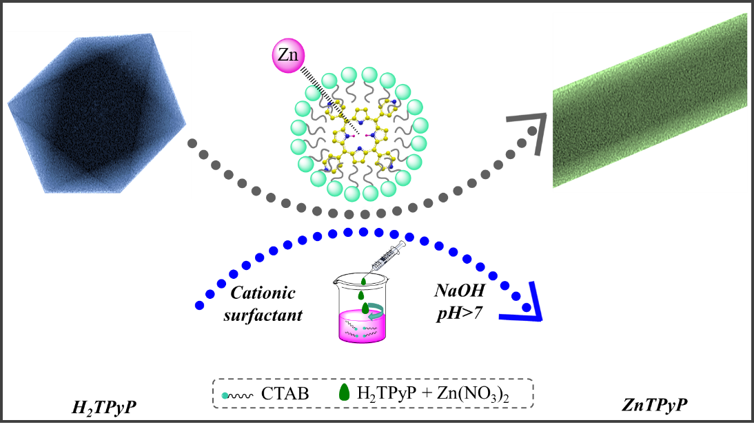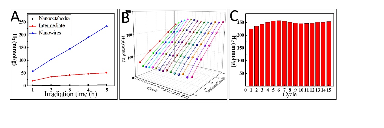 可见光光解水制氢是解决能源和环境问题的有效途径,其关键在于新型光敏剂材料的制备及改性。但目前常见的光敏剂普遍存在可见光利用率低、激发态电子-空穴对寿命短、不易水相分散以及稳定性较差的问题。本研究采用酸碱中和-胶束限域卟啉可控自组装方法,设计和控制分子间弱键相互作用,一步法实现四吡啶基卟啉的金属化及自组装,合成之辈了组成、形貌、结构可控的水相单分散卟啉组装体,其长程有序的π-π堆积,可以有效的增强组装体的可见光吸收截面积,增强分子间激发态能量和电子转移的效率,降低电子-空穴的复合,提高激发态电子-空穴寿命,获得高效可见光光解水催化剂。卟啉组装体体现出优异的催化性能以及明显的结构依赖性,同时有很好的稳定性,每次光照5小时,重复使用15次后催化效率基本不变。