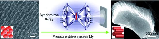 金刚石压腔(diamond anvil cell)是由一对金刚石对顶砧和密封垫组成。将样品和测压红宝石同时放入金刚石压砧密封垫中,旋紧压砧。因为两个金刚石接触面小,机械加压部分面积大,可使金刚石压腔获得高压,达到10~几十吉帕,可以研究不同材料在高压下的行为。研究中我们将单分散纳米金组装形成Hexagonal堆积的自支撑薄膜,移入压腔后,加压超过8Gpa,高压使得金颗粒客服表面配体的束缚作用相互粘结行程多晶单分散一维纳米线。这一方法很好的研究了纳米晶自组装体在高压下的组装行为,为合成单分散多晶纳米金线提供了一个可行的方法,并且为其它一系列无机纳米晶组装体在超高压下的组装行为研究提供了理论和技术指导。