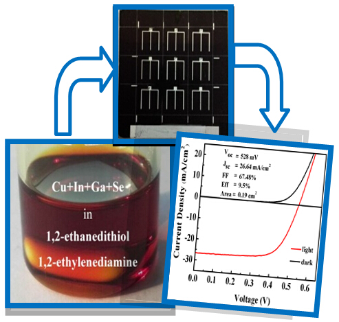 CIGSe前驱体溶液(左下),CIGSe薄膜太阳能电池器件(中),CIGSe电池的J-V曲线(右下)
