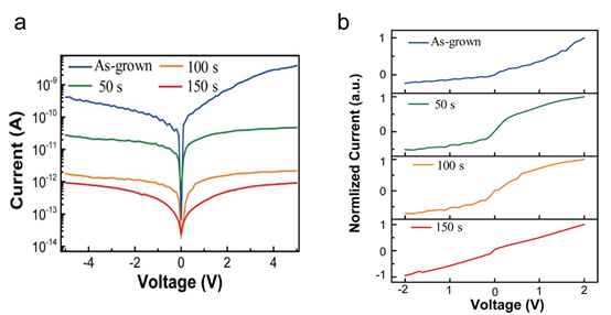 图三 微等离子体表面钝化前后半对数的电流-电压曲线(a)及线性坐标中归一化的电流-电压曲线(b)。