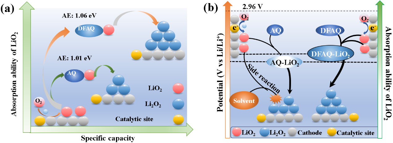 在前期工作中,我们提出了“仿生酶-辅酶协同氧还原催化反应”的研究思路。通过在电解液中加入能够捕获超氧化物的蒽醌分子,抑制正极表面致密过氧化锂膜的生成,促进固态催化剂表面氧还原反应过程(J. Am. Chem. Soc., 2019, DOI:10.1021/jacs.8b13568)。在该研究工作中,通过在蒽醌分子骨架上引入不同的供吸电子基团,实现了对放电中间产物LiO2稳定性的可控调控。研究发现,含吸电子基团的1,4-二氟蒽醌(DFAQ)对LiO2的吸附强度最高,可以最大程度地稳定LiO2,从而大幅提高表面ORR的反应速率和稳定性。这一结果证明蒽醌助催化剂对LiO2吸附能的强弱对ORR的活性/稳定性具有重要影响。该研究工作不仅为调节锂氧气电池放电中间产物LiO2的稳定性提供了新的技术手段,还有助于进一步理解非质子溶剂体系下氧还原反应机制(Sci. China Mater., 2020, DOI: s40843-020-1519-9)。