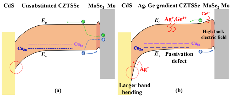 阻碍锌黄锡矿Cu2ZnSn(S,Se)4(CZTSSe)太阳能电池进一步发展的主要原因是由体相缺陷和电荷提取界面导致的性能损耗。本文提出一种Ag, Ge双梯度吸收层结构,实现前接触吸收层价带下移和背面接触吸收层导带上移,改善CZTSSe器件性能。实验结果表明,Ag取代Cu能够在p-n结处产生更大的能带弯曲,而Ge取代Sn能够在准中性区内施加一个额外的迁移场。另外,扩散到吸收层中的银离子和锗离子将钝化CuZn和CuSn深能级缺陷。Ag, Ge双梯度结构的吸收层能够加速电荷的提取和传输并使复合损失最小化,有效提高了器件的Voc和Jsc,最终取得12.26%的光电转换效率(开路电压损耗为553 mV)。该研究成果是目前胺-硫醇溶液体系的最高效率,对于后续铜锌锡硫硒薄膜太阳能电池的界面性能改善及吸收层结构优化具有重要的意义。