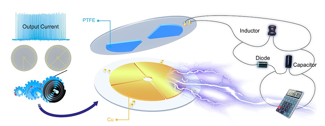 物联网的发展需要数以十亿计的传感器。这些传感器需要合适的、可持续的能源供应。通过从环境中收集机械能并高效的转化为电能,摩擦纳米发电机(TENG)被用来发展自驱动传感系统。然而,TENG具有输出电压高、电流低的特点,因此需要合适的电源管理电路将其输出转化为稳定的低电压、大电流形式。但是,TENG的内部等效阻抗(1-100 MΩ)远大于电管管理电路的等效阻抗(一般小于1 kΩ),导致TENG的能量无法转移到电源管理电路中。在之前的工作中,我们课题组通过引入同步触发机械开关(STMS),发展了脉冲TENG(Pulsed-TENG)。STMS的引入降低了TENG的内部等效阻抗,实现了最大化的输出能量。然而,由于难以实现适合的STMS,转动式Pulsed-TENG的报道很少。而相对于其它工作模式,转动式TENG具有更高的输出性能、稳定性和耐久性。因此,实现旋转Pulsed-TENG对自驱动系统的发展具有重要意义。