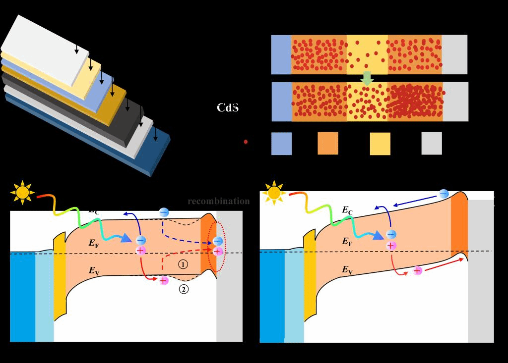 由于锌黄锡矿Cu2ZnSn(S,Se)4(CZTSSe)材料的相区较窄,通常使用贫铜组分的吸收层结构设计避免吸收层内部杂相的产生。目前贫铜结构器件获得了最高的记录效率,但由于该结构准中性区电荷传输能力较差且背界面电荷复合严重,导致性能进一步提升的空间有限。相对而言,富铜结构的吸收层具有良好的电荷传输性能,可以弥补贫铜吸收层的不足。然而,其表面费米能级钉扎及电荷复合较大,引起的器件性能衰减更加严重。基于贫铜组分在前界面以及富铜组分在背界面的优势,我们设计了一种三层(大晶粒/小晶粒/大晶粒)的铜梯度吸收层结构,底部铜含量较高而表面铜含量较低。较高的铜浓度可以增加载流子浓度,通过构筑载流子浓度梯度改善电荷传输驱动力。同时,高铜组分可以使吸收层价带上移,降低空穴的注入势垒,从而降低背界面复合。顶部的贫铜结构减缓了表面的费米能级钉扎并有利于界面能带弯曲的保持。最终,铜梯度吸收层优良的电学性能使器件效率达到12.54%,该效率是目前胺-硫醇体系的最高效率,对于后续铜锌锡硫硒薄膜太阳能电池的界面性能改善及吸收层结构优化具有重要的意义。