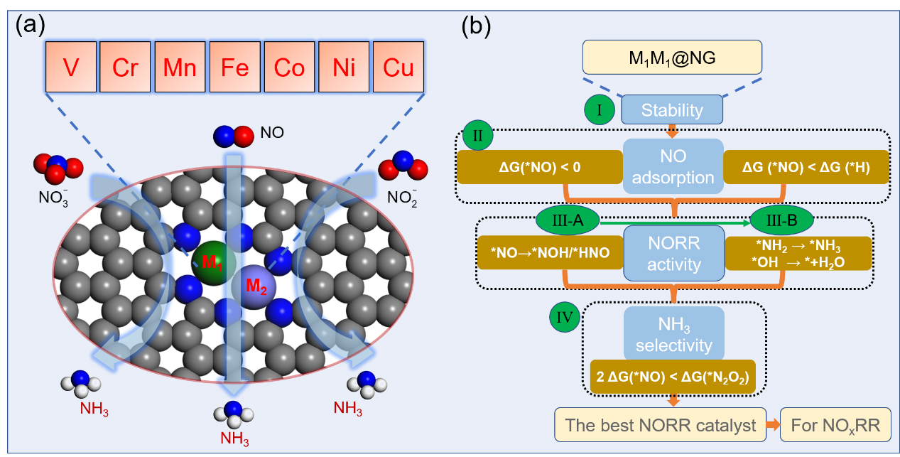 NO质子化过程是NO3RR或NO2RR反应的必经之路,结合NORR的关键加氢反应步,该工作提出了一种重点关注NORR关键质子化反应步的筛选策略(如图)。以金属二聚体嵌入到氮掺杂石墨烯构成的双原子催化剂(M1M2@NG)为例,首先利用第一性原理方法从28种M1M2@NG候选体系中成功地筛选出对NORR具有最高电催化活性的催化剂(Cu2@NG),再通过计算证明其对NO3RR或NO2RR也具有高电催化活性。基于微观机制分析,得到一个不需要进行理论计算的催化活性描述符,即金属原子二聚体的d轨道价电子数。根据这个简单的描述符,在具有较多d轨道价电子数目的4d和5d后过渡金属基双原子催化剂中利用提出的策略进行筛选验证,发现Ag2@NG也是一种高活性三功能NOxRR电催化剂。第二轮筛选测试证明提出的策略和催化活性描述符的有效性。
