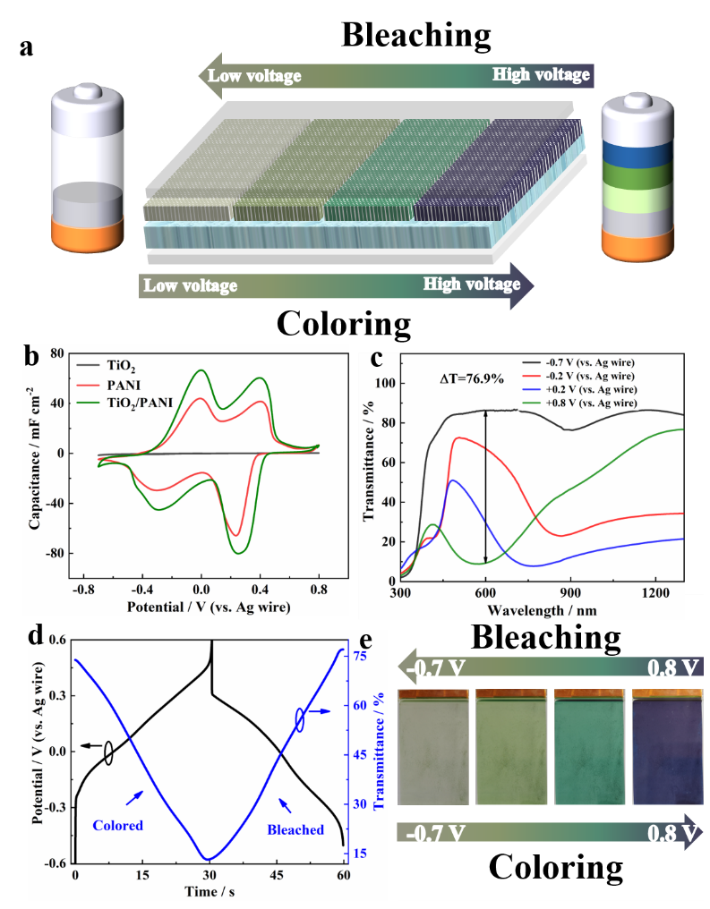 电致变色显示器件具有无视野盲角,驱动电压低,提高眼睛的舒适度等优点,但目前电致变色器件存在颜色变化单一、变色速度慢等问题,严重制约其在显示领域的发展。针对上述问题,本工作开发了一种基于TiO2和聚苯胺(PANI)的大面积纳米复合膜,通过结合静电喷雾沉积和电聚合技术,同时实现电致变色和储能高效输出。这种组合策略为具有良好控制形态和结构的高性能金属氧化物/导电聚合物复合材料提供了一种新策略。所获得的具有海胆状多孔结构的TiO2/PANI复合膜具有独特的电子供体-受体结构,促进了电子从PANI到TiO2的传输。因此,纳米复合薄膜在电致变色和储能方面均表现出优异的电化学性能,例如大光学调制(76.9%)、短切换时间(< 3.6 s)和高着色效率(78 cm2 C-1)。此外,基于多色复合材料,设计并构建了具有能量实时监测功能的智能储能指示器,通过不同的颜色变化,可以实时直观地检测到储能水平。这项工作为在双功能电致变色储能领域开发多变色纳米材料开辟了新思路。