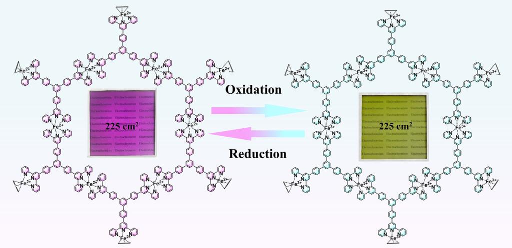 金属-超分子聚合物是电致变色材料的重要组成。目前,金属-超分子聚合物主要是通过液—液界面法合成的。采用该方法制备的材料存在尺寸大小受限和与基底结合力不牢导致循环性能较差的问题。开发可大面积制备且循环稳定性好的金属-超分子聚合物是该领域的巨大挑战。针对于此,本项工作采用“一锅法”合成金属-超分子聚合物(MSP-Fe),可以实现“克”级的产物制备;基于MSP-Fe溶液,进一步采用静电喷涂实现了大面积材料薄膜的制备。其中,所制备的MSP-Fe薄膜表现出优异的电致变色性能:高的光学对比度(> 71.7%),快的转换速度(< 1.5 s)及高的着色效率(1103.9 cm2 C−1);且薄膜在电化学循环10000次后,光学对比度仅仅衰减了3%,表明了其良好的循环稳定性。该材料优异的电致变色性能主要归因于该分子骨架的共轭结构有利于电子传输和孔结构有利于离子传导的协同效应。进一步的动力学研究表明,电容行为主导了该电化学反应过程,且MSP-Fe也表现出良好的储能行为。此外,基于MSP-Fe所制备的电致变色器件也表现出均匀、快速、高效的变色行为和储能行为。所制备的器件在储能条件下可以驱动外部负载,且可以通过不同颜色显现器件不同的储能程度。总之,该金属-超分子聚合物的合成方法和薄膜制备工艺为构筑大面积电致变色储能器件的发展提供了有效途径。