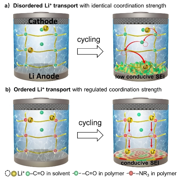 图a)传统准固态电解质中无序且缓慢的离子传输行为;b)新型准固态电解质中有序且快速的离子传输行为。