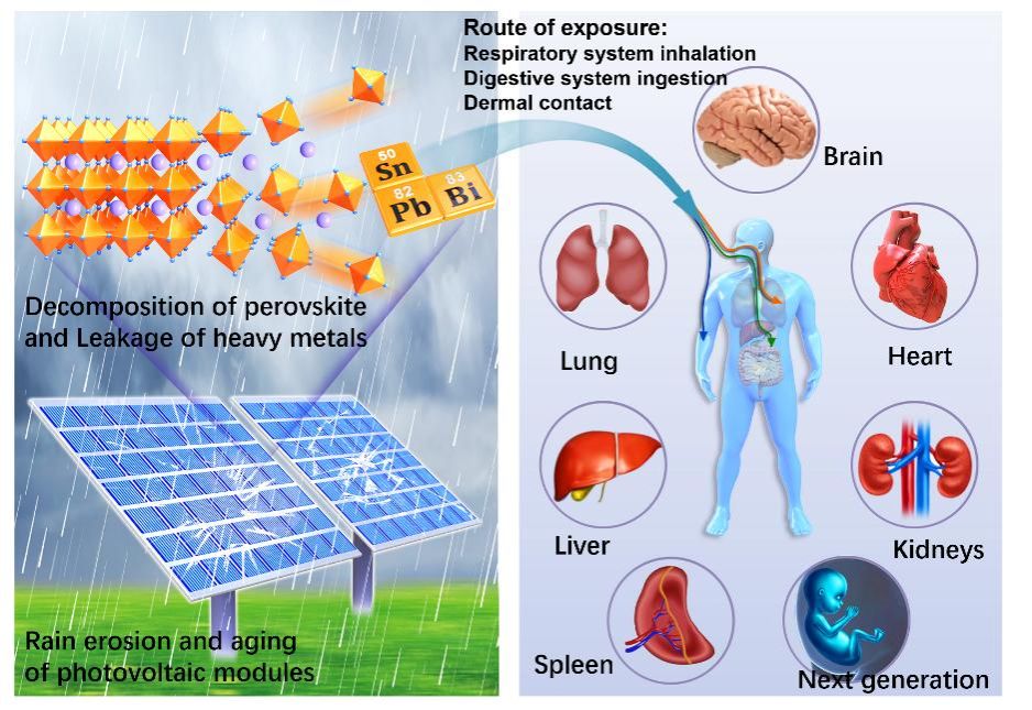 卤化物钙钛矿是具有优异光电特性的晶体半导体,正在迅速向大规模应用发展。重金属铅离子(Pb2+)是制备卤化物钙钛矿的核心元素,可以取代包括钙、锌和铁等调节重要生理功能的关键二价元素。此外,金属锡离子(Sn2+及其氧化态的Sn4+)和铋离子(Bi3+)也是卤化物钙钛矿中的重要成分。由于此类钙钛矿具有生物兼容性,其重金属分散到环境中将具有严重的风险。因此,对卤化物钙钛矿中重金属的生物毒性及其对健康影响的评估是至关重要。