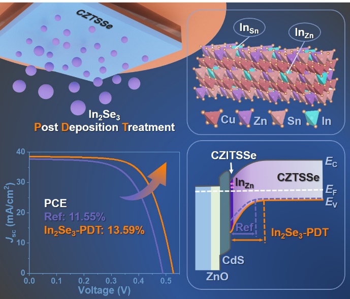 异质结界面的固有缺陷是限制Kesterite太阳能电池效率的主要问题之一。本研究提出了一种In2Se3沉积后处理重构异质结界面的策略。在CdS/CZTSSe异质结中插入CZITSSe层重构异质结界面,由于In3+Zn2+Sn4+位点的局部占据减少了Zn和Sn相关的无序深能级缺陷;同时在 CZITSSe 过渡层中生成了良性InZn供体缺陷,从而有效地促进了表面的p-n转换。最终,获得了13.59%的光电转换效率(PCE)。