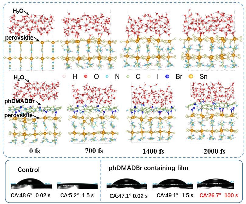 针对上述问题,课题组与上海同步辐射光源苏圳煌博士、德国亥姆霍兹柏林材料与能源中心李桂香博士等团队合作,引入一种新的多功能分子,1,4-苯基二甲基二溴铵二胺(phDMADBr),促使锡基钙钛矿膜表界面重构,并形成具有稳定结构的保护层。phDMADBr与钙钛矿表面的强相互作用改善了电子转移,钝化了不配位的Sn(II),并增强了对水和氧的抗性。原位GIWAXS分析证实了准二维相的热稳定性增强,从而提升钙钛矿的环境稳定性,在10% RH湿度N2环境下保持90%以上原始效率达200小时。本实验提出了一种钙钛矿表面重构的新方法,以提高锡基钙钛矿器件的工作稳定性,为推进无铅光电应用提供了一种策略。