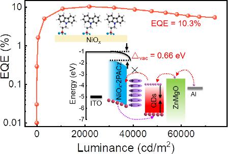 图1. QLED器件EQE-L特性曲线;NiOX/SAM基QLED机制示意图。