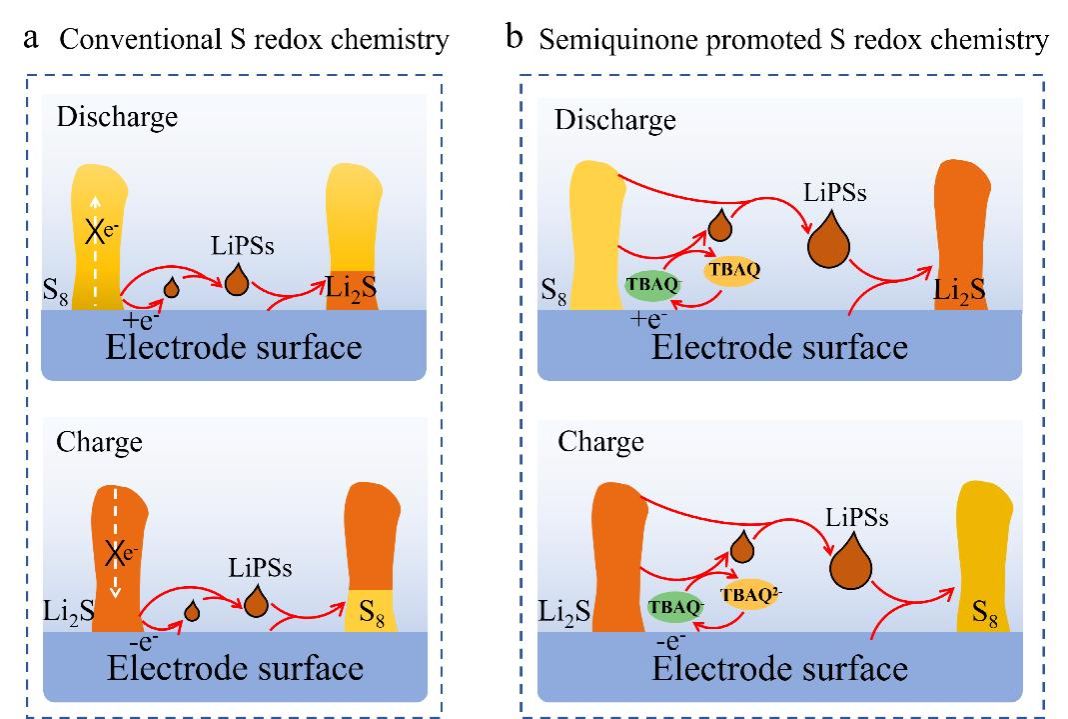 针对上述问题,材料学院赵勇课题组构建了一种新的催化化学反应路径:可溶性的2-叔丁基-半蒽醌锂(Li+TBAQ•−),可同时作为电子的供体和受体进行化学S还原和Li2S氧化。在初始充放电状态下,Li+TBAQ•−能够有效的对固体S和Li2S活化,增加可溶性LiPSs量生成,从而通过液相电子转移路径促进S和Li2S长程电子转移进而大大提高正极反应速率,进一步有效地提高了锂硫电池的倍率性能和循环稳定性。锂硫电池在硫载量为7 mg cm-2、电解液/硫(E/S)比例为7时,其放电容量是未添加Li+TBAQ•−电池的5倍。上述研究为发展新型硫正极液相催化剂、构建高效锂硫电池正极反应路径提供了全新思路。