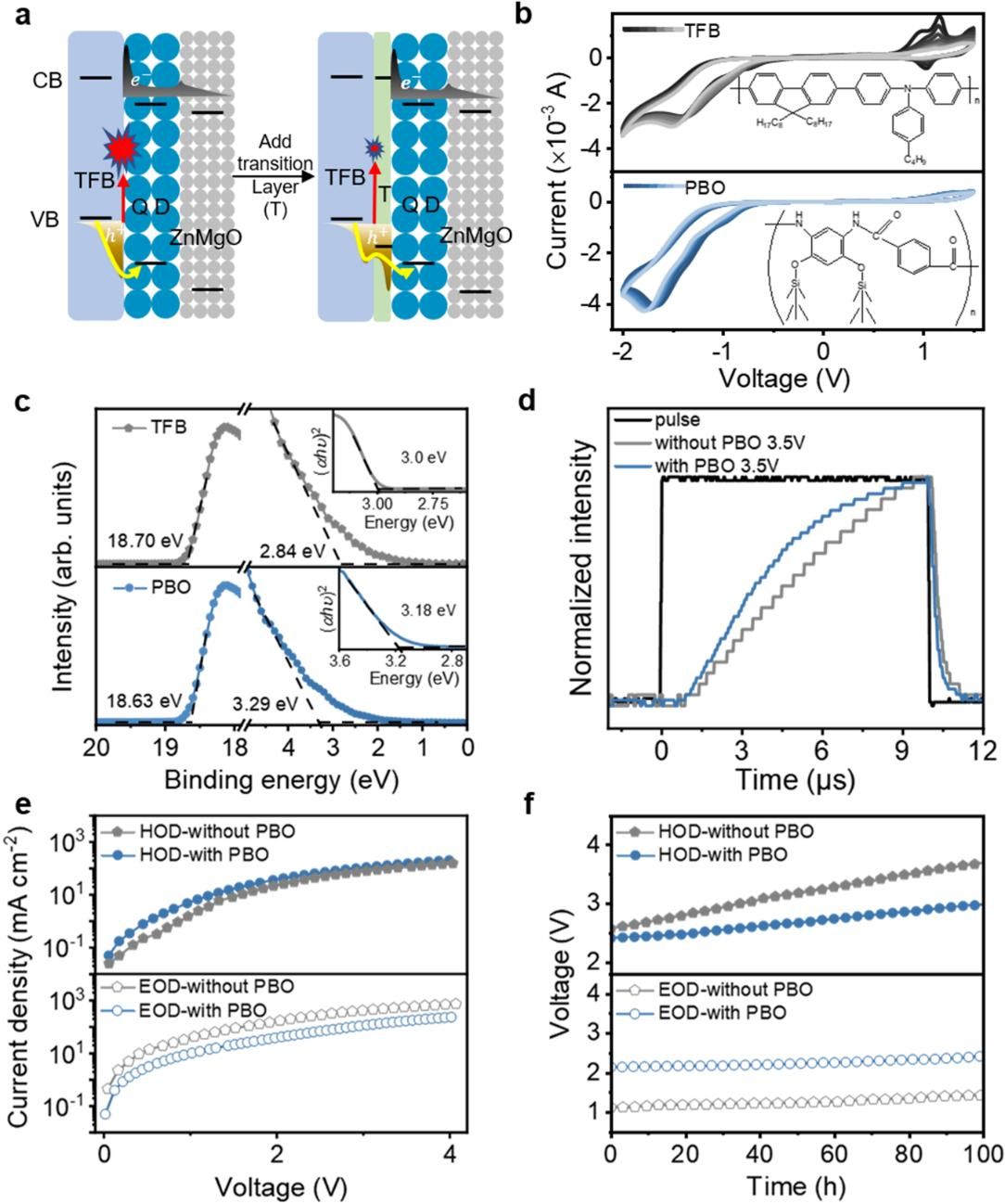 在本项研究中,通过在QD/HTL界面处引入具有高电化学稳定性的PBO抗氧化层以提高HTL的稳定性,减缓因空穴堆积造成的HTL损伤。且 PBO抗氧化层的价带能级位于QD和HTL之间,可以有效的减少空穴注入势垒,提高空穴注入并减少载流子在HTL界面的累积(图1)。 PBO的引入使器件内部空穴注入更为有效,漏电流得到很好的抑制,减少因空穴堆积造成的器件退化。