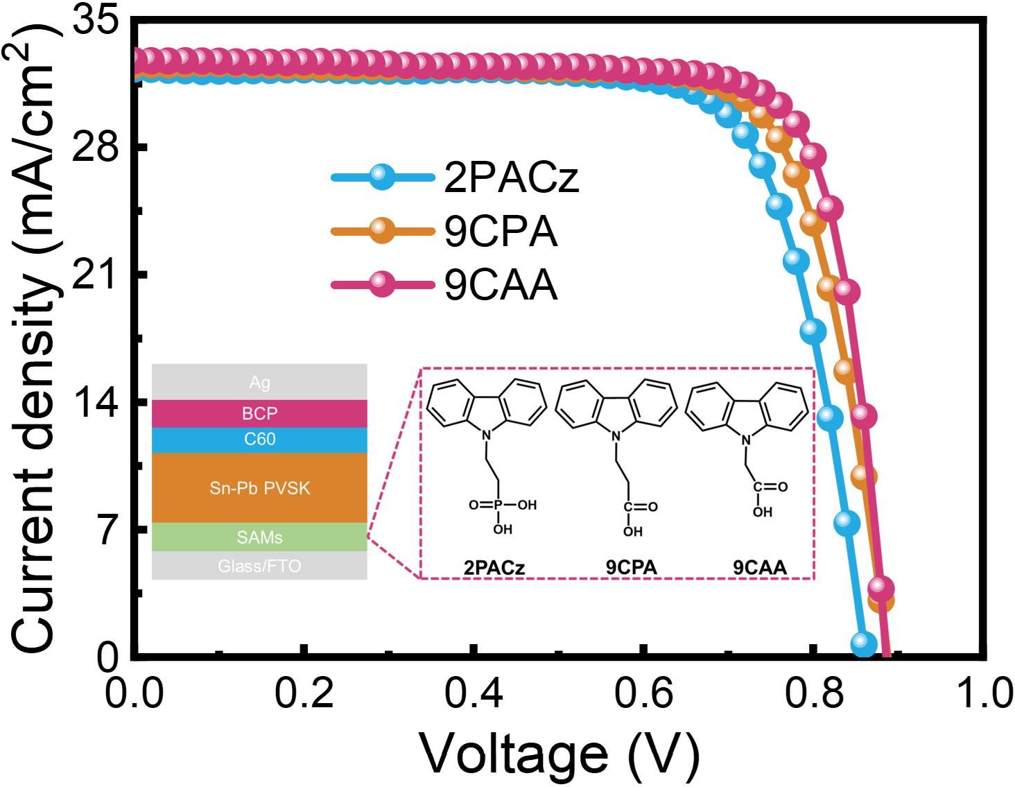 图1. 基于不同Sam的锡铅钙钛矿器件J-V曲线,器件结构和SAM分子结构图。