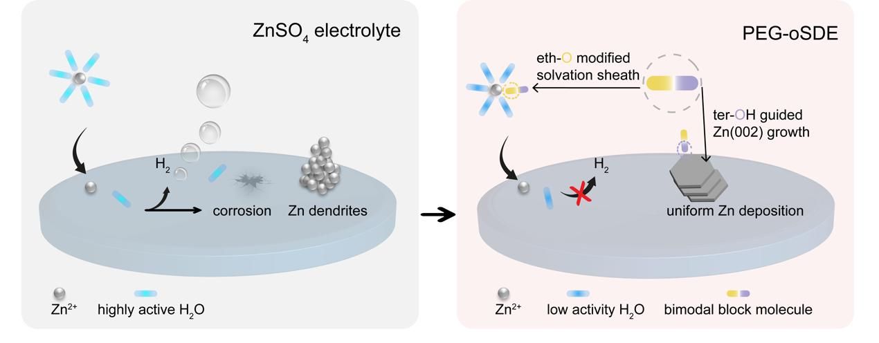 图1左)锌金属电极循环过程中的副反应和枝晶生长。右)电解液中双功能模块的聚乙二醇(PEG)添加剂抑制锌金属副反应和枝晶生长(PEG中醚氧和羟基氧两种官能团分别调控电解液溶剂化环境和金属锌表面结构,进而促进金属锌电极稳定循环)。