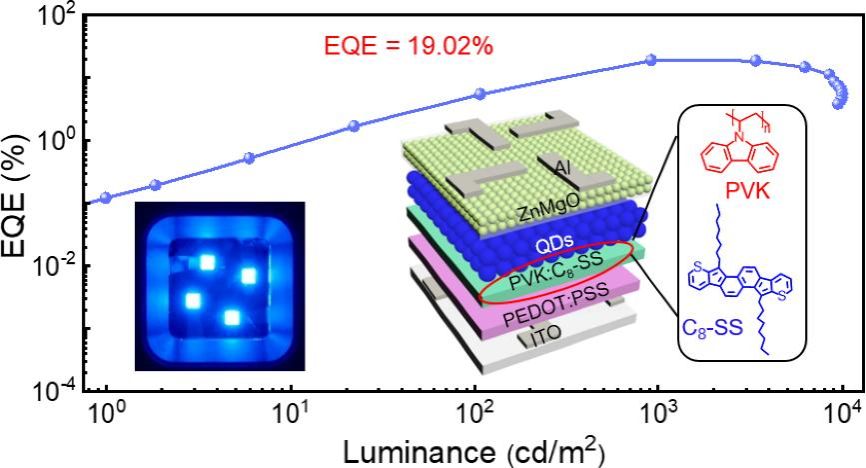图1.基于PVK:C8-SS HTL的蓝色QLED器件EQE-L特性;器件结构和分子结构示意图。